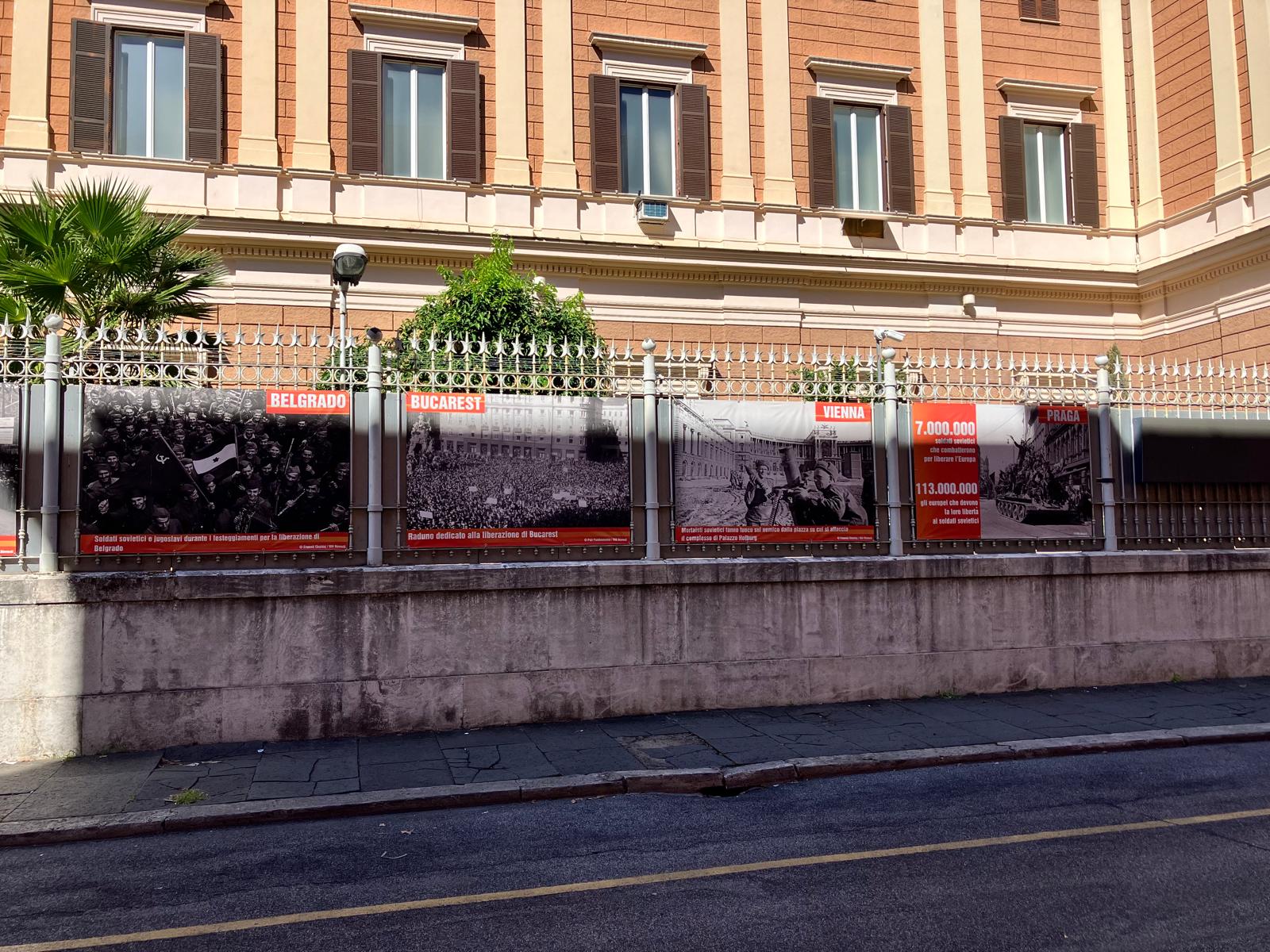 Ambasada Federației Ruse la Roma a organizat o expoziție propagandistică pe gardul ambasadei sale din capitala Italiei, Roma, în care pretinde că a eliberat România de fascism în 1944, scrie Aktual24.