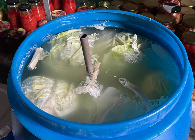 Pritocirea periodică cu o vergea de lemn oxigenează saramura și stabilizează fermentația.